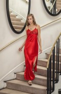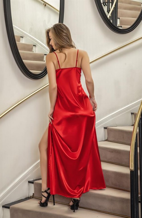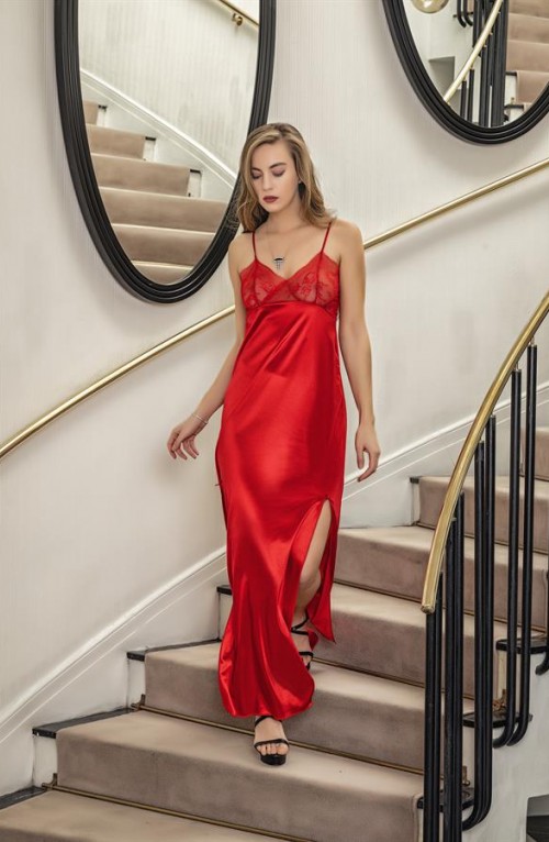DANTELLİ UZUN YIRTMAÇLI SATEN GECELİK ELBİSE STRİNG TAKIM KIRMIZI (MGP31512)