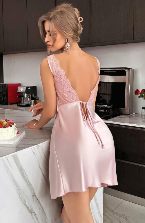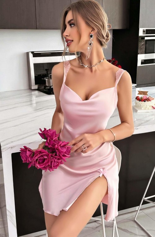 Kadın Saten Askılı Dantel Detaylı Gecelik - Pudra Pembe 2224