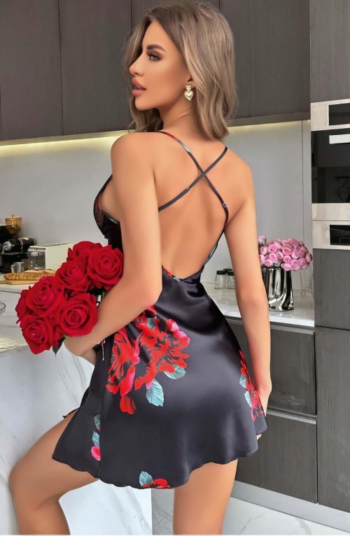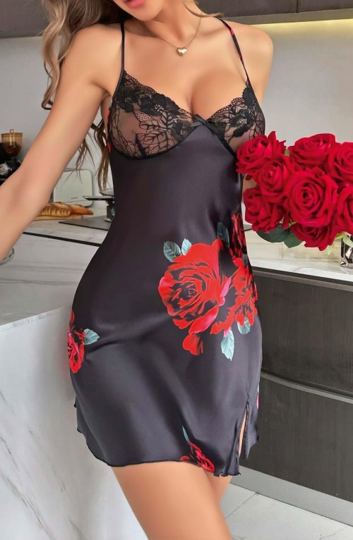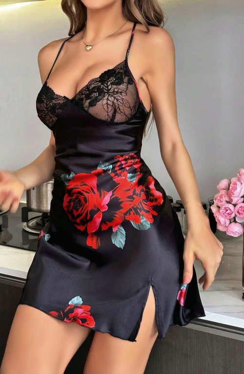 Kadın Siyah Saten Askılı Dantel Detaylı gül çicek baskılı Gecelik 2221
