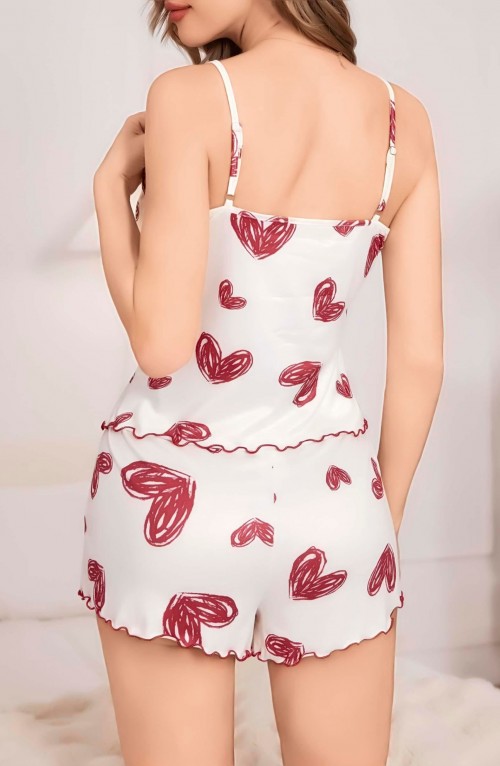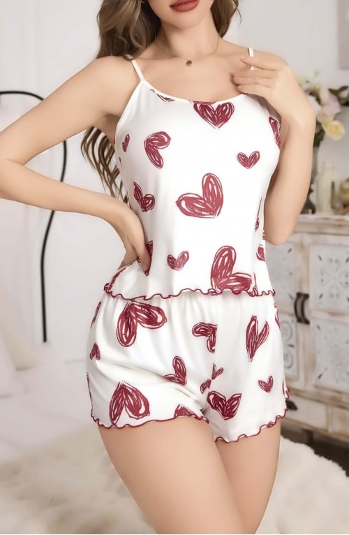 Kadın Beyaz Kalp desenli Şortlu Gecelik Pijama Takımı 5052