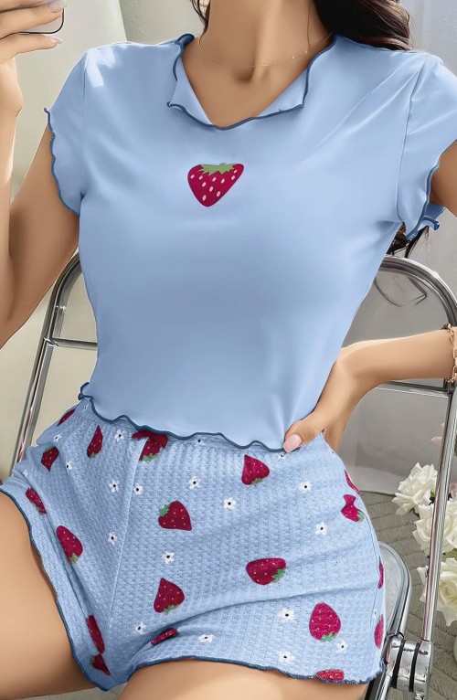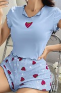 Kadın Çilek Desenli Bebe Mavi Seksi Gecelik Takım 5005