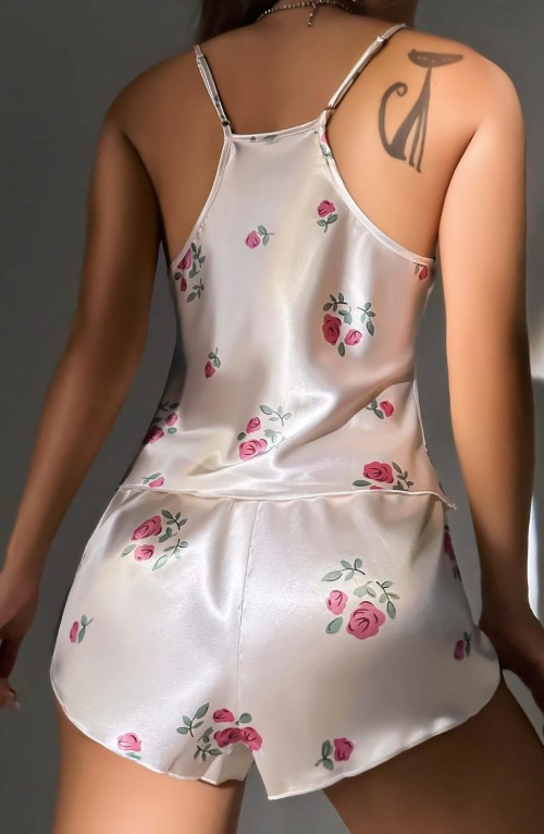 Kadın Ekru Gül Desenli Askılı Dantel Üst Pijama Takımı 2222