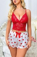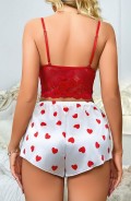 Kadın Kırmızı Kalp Desenli Şort Askılı Dantel Üst Pijama Takımı 2218