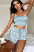 Kadın Mavi Çizgili Desenli Askılı Şortlu Pijama Takım 5001