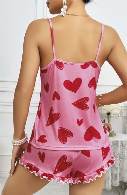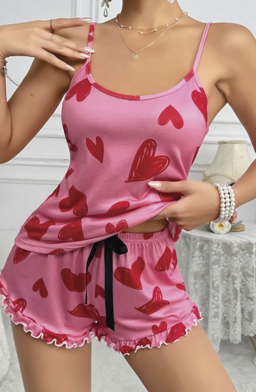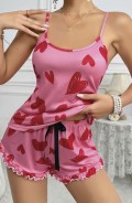 Kadın Pembe Kalp Baskılı Şortlu Gecelik Pijama Takımı 5050