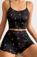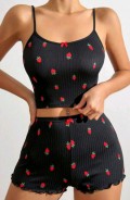 Kadın Siyah Çilek Desenli Seksi Gecelik Takım 5020