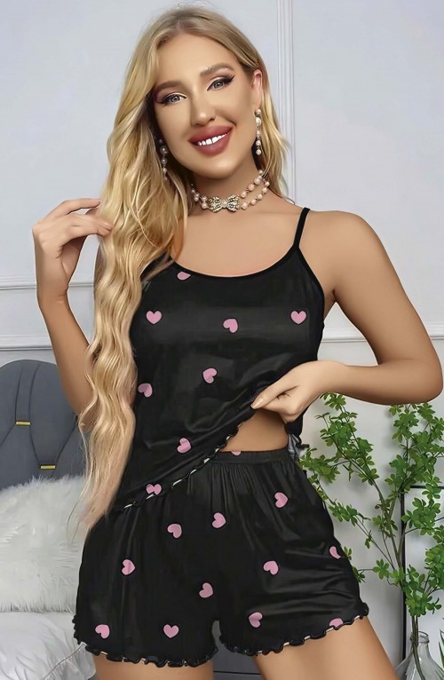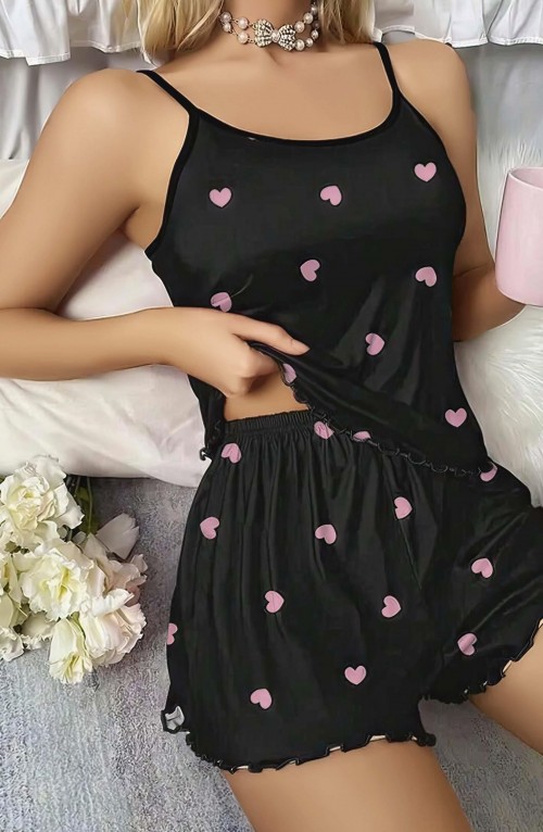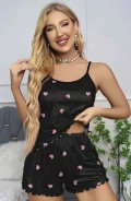 Kadın Siyah Kalp Desenli Askılı Şortlu Gecelik Takım 5018