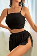 Kadın Siyah Yandan Yırtmaçlı Askılı Şortlu Pijama Takım 5041