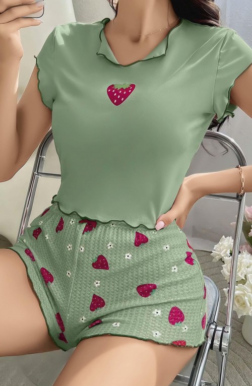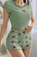 Kadın Yeşil Çilek Desenli Askılı Şortlu Pijama Takım 5004