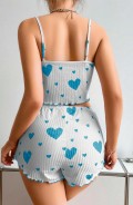 Kadın Beyaz Mavi Kalp Desenli Askılı Şortlu Pijama Takım 5043