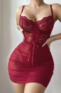 Kadın Kırmızı Fantezi Gecelik Tül Dantel Fiyonk Detaylı Askılı 2209