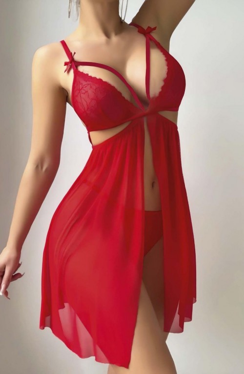 Kadın Kırmızı Fantezi Gecelik Tül Göğüs Dekolteli Önü açık 2194