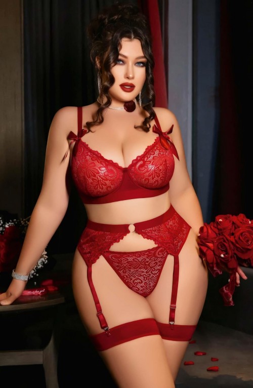 Kadın Büyük Beden Kırmızı Dantelli Jartiyerli Fantezi İç Giyim Takımı 8005