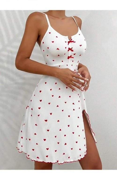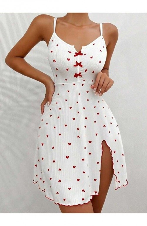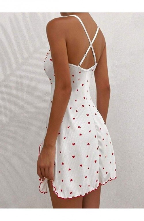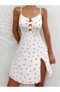 Kadın Beyaz Kırmızı Kalp Desenli Askılı Elbise 5066
