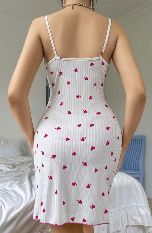 Kadın Beyaz Kırmızı Kalp Desenli Yandan Dantel Detaylı Askılı Elbise 5070